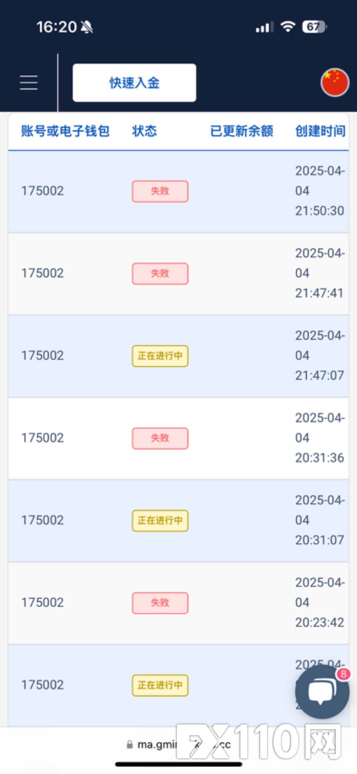 2025年4月4号,周五,北京时间晚上10点左右,我持仓白银加原油,账户2700美金,行情波幅较大,我看着账户有可能有危险怕爆仓,就立刻入金,金额7千到8千,前前后后折腾了一会,尝试了GMI提供的入金渠道,数字货币渠道进去没人接单,银联通道跳转页面没有收款人,最终无法入金导致爆仓,而行情在爆仓后立马大涨,我账户但凡有一次入金成功都不会爆仓,可笑的是,我爆仓后就变一切正常,入金可以正常入了,2025年4月7号星期一,早上,我账户持仓黄金加白银,其中主要是白银,仓位较轻,但也被爆仓,白银在27.94给我爆仓了,而GMI白银盘面最低才27.95,我感到不对劲,立马查看了其他几个大的平台公司报价,包括国内几个专业的财经类公司报价,价格都是28.2,更可笑的是GMI本公司其他账户报价白银28.2,就偏偏把我的账户给打爆仓,这一切事实明显,证据确凿,对此我联系了GMI公司,在等了几天后并未解决,我在GMI做了好几年,亏损止损几万美金,以前是认为自己的原因,但这次接连的事让我发现,这个平台并不像想象的一样正规,以上内容全部真实可靠,没有一句假话