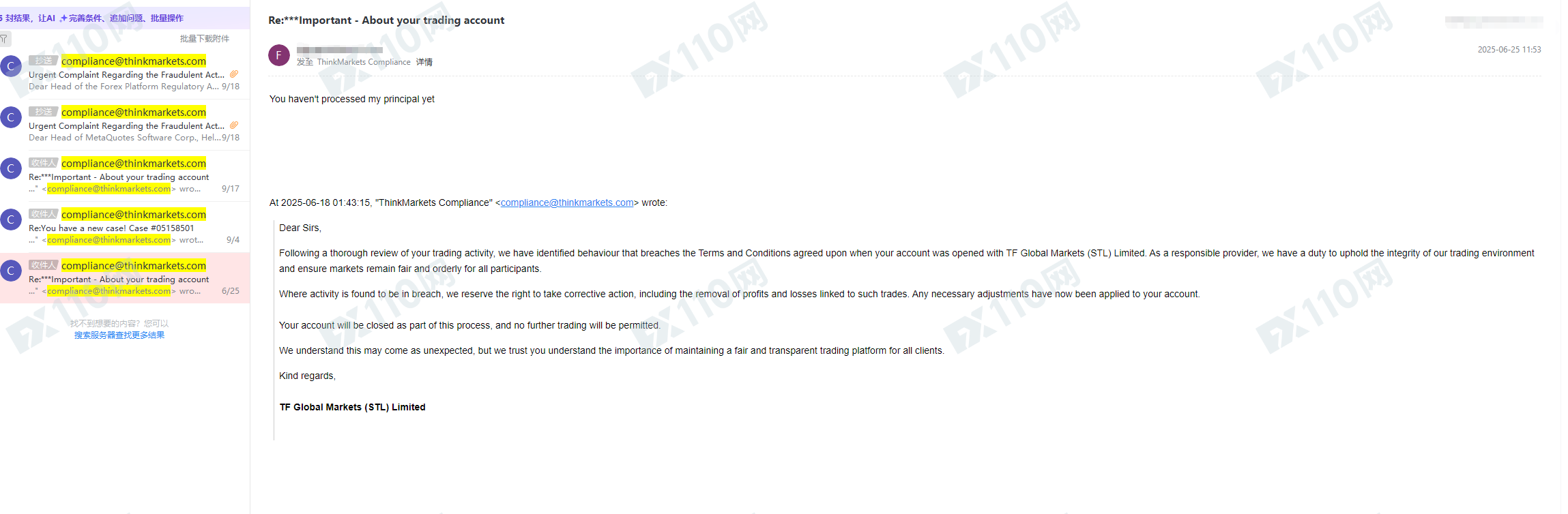 今年4~5月份入金了30000USD,在2025年6月10日,由于单边行情,我的账户产生了收益,随之不久后我收到一封来自thinkmarkets平台的邮件,声称我参与了非法活动,并通知我他们将调整账户余额并关闭我的账户!他们不仅仅扣除了我全部利润43,685USD,我尝试出金本金30000USD三个月以来一直不予处理!三个月以来我多次联系智汇平台索要我的本金和利润,该平台都是置之不理,没有任何反应!我甚至投诉了监管,他们是黑平台,根本不会被合法监管,大家千万不要来这个平台!!!!