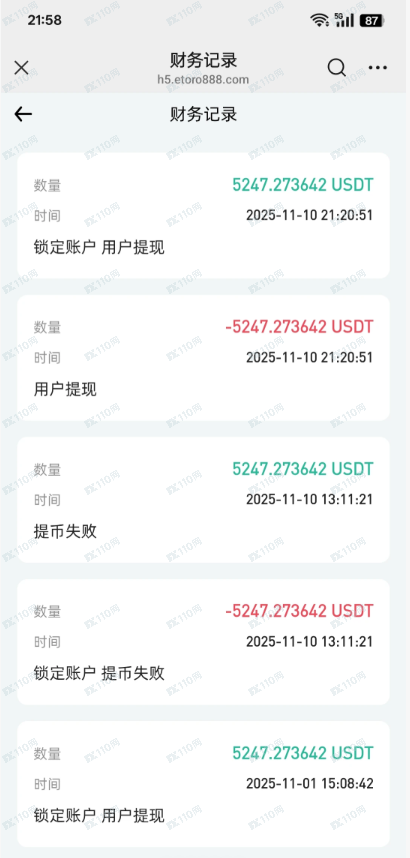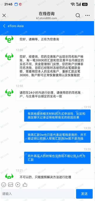 再就是上周一我在平台要把钱卖出去,平台客服说汇款人和账户名不一致,需要我自己再汇款3w,我当然不会汇,于是和他联系 说自己没有钱,他问我说还有1w,然后他说他美金账户有点钱,差7000 让我转他,这个时候我还抱有一丝侥幸,所以我转了,接着下午他说美金账户差一点让我再转2000,后来他说处理好了周一能到账,但是我周一联系客服就很难得到回复,账户仍然显示提现失败,今天已经显示账户被锁定。对了上周五晚上还给我电话说他要给朋友还钱,他朋友借的高利贷,让我给他想办法搞1w现金,我说没有钱,他竟然说让我信用卡套现,然后一直给我电话 直到周六,我没有接 也没有转