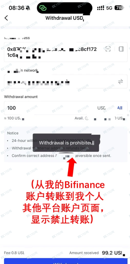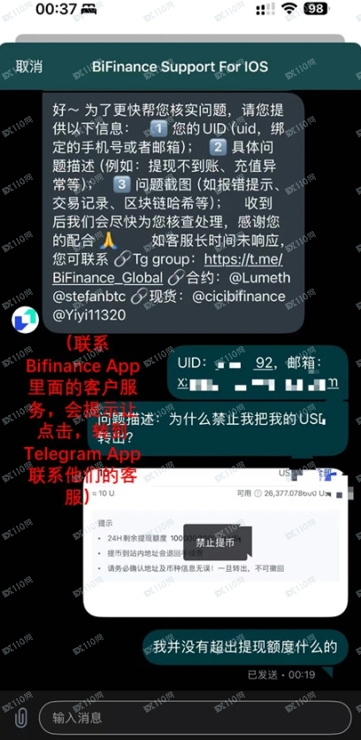 Support BiFinance人员以 “同步” 问题,让我从外部账户转100美金到他们指定账户,还说朋友账户转也行,解决个人问题却要他人转钱。