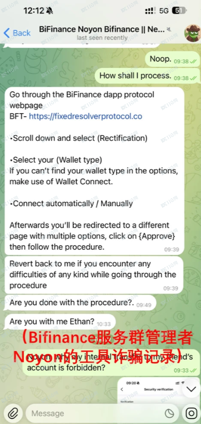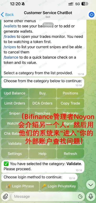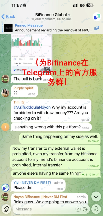 之后我多次联系客服,官方app引导至Telegram上的客服群沟通。群里有管理人员Noyon和Support BiFinance人员。Noyon提出给操作工具,要求授权外部账户核心信息实现 “同步”,还把我转给其他服务人员,其工具竟要我在手机打开我个人外部账户以便他们直接进入。