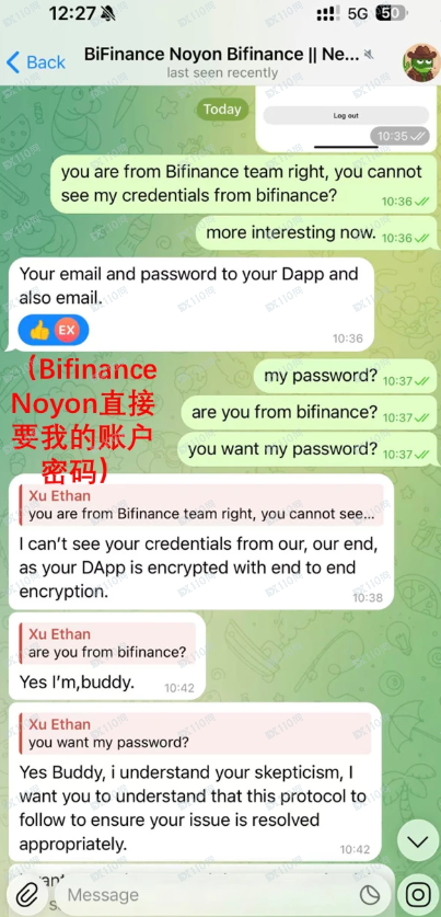 最后,Noyon竟让我提供Bifinance账户及密码,至此我严重怀疑平台人员多波且非一伙。平台工作人员让客户提供账户密码和邮箱,其诈骗本质暴露无遗。